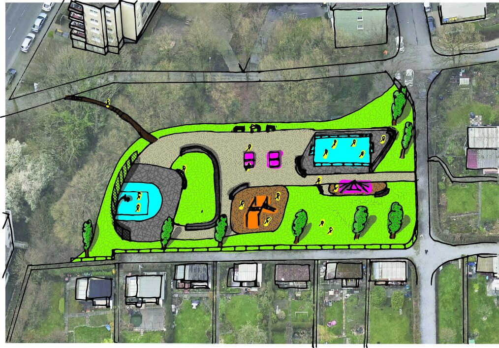 Auf der Fläche des Spielplatzes Allensteiner Straße befinden sich ein aufgegebener Bolzplatz, der nicht mehr benutzbar ist, Reste eines ehemaligen Spielplatzes und eine Fläche mit Bäumen und hohen Sträuchern. Von der Gesamtfläche (3.500 m²) können nach Abzug der Böschungsflächen ca. 2.000 m² als neuer Spielplatz gestaltet werden. Der Spielplatz Hermannstraße befindet sich 150 Meter nördlich. Daher ist eine funktionale Aufgabenteilung vorgesehen. Im Rahmen einer Spielplatzanalyse wurden die im Quartier sehr nah beieinander liegenden Spielplätze Hermannstraße, Kreuzstraße und Allensteiner Straße in Bezug auf ihre Potentiale und Spielangebote untersucht. Für jeden der Spielplätze wurde ein Schwerpunkt festgelegt. Der Spielplatz an der Allensteiner Straße wird durch die Umnutzung des Bolzplatzes und die Erschließung einer dahinter liegenden Fläche deutlich erweitert und einer sinnvollen Nutzung für die Zielgruppe Kinder bis 14 Jahre zugeführt. Ziel ist es, in den dicht bebauten Bereichen eine hohe Qualität auf engem Raumanzubieten.